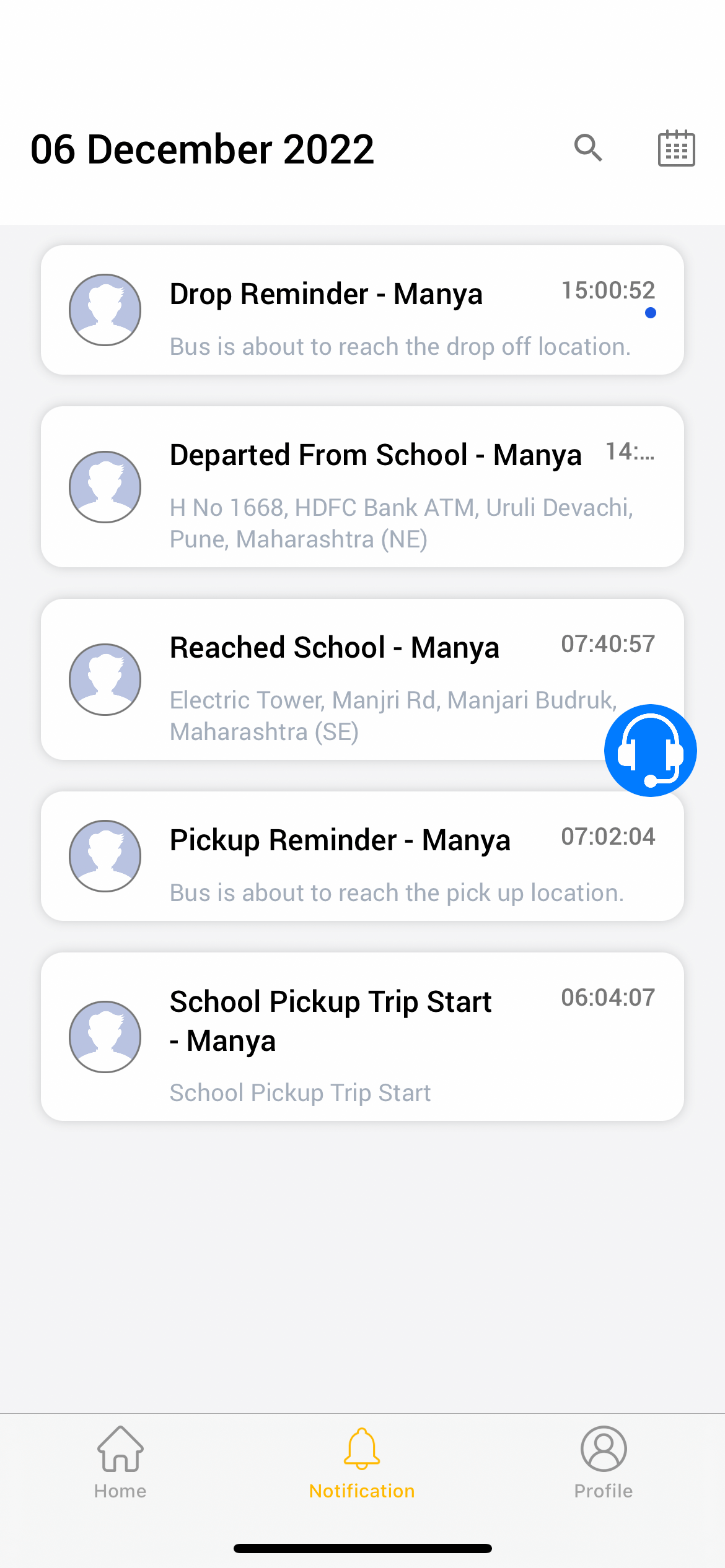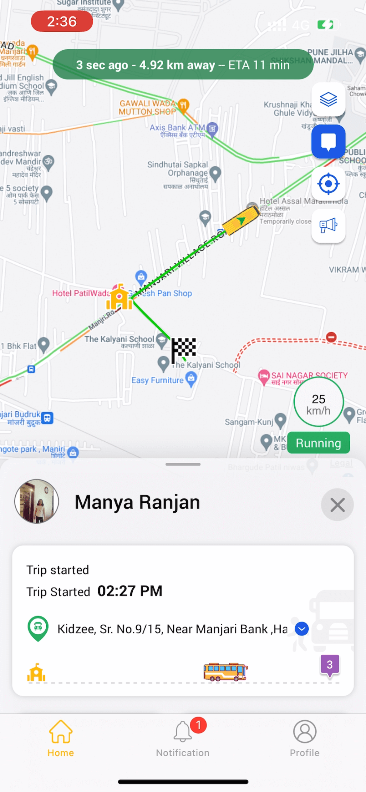 Parents are alerted when the school bus is delayed or any unplanned incidents.